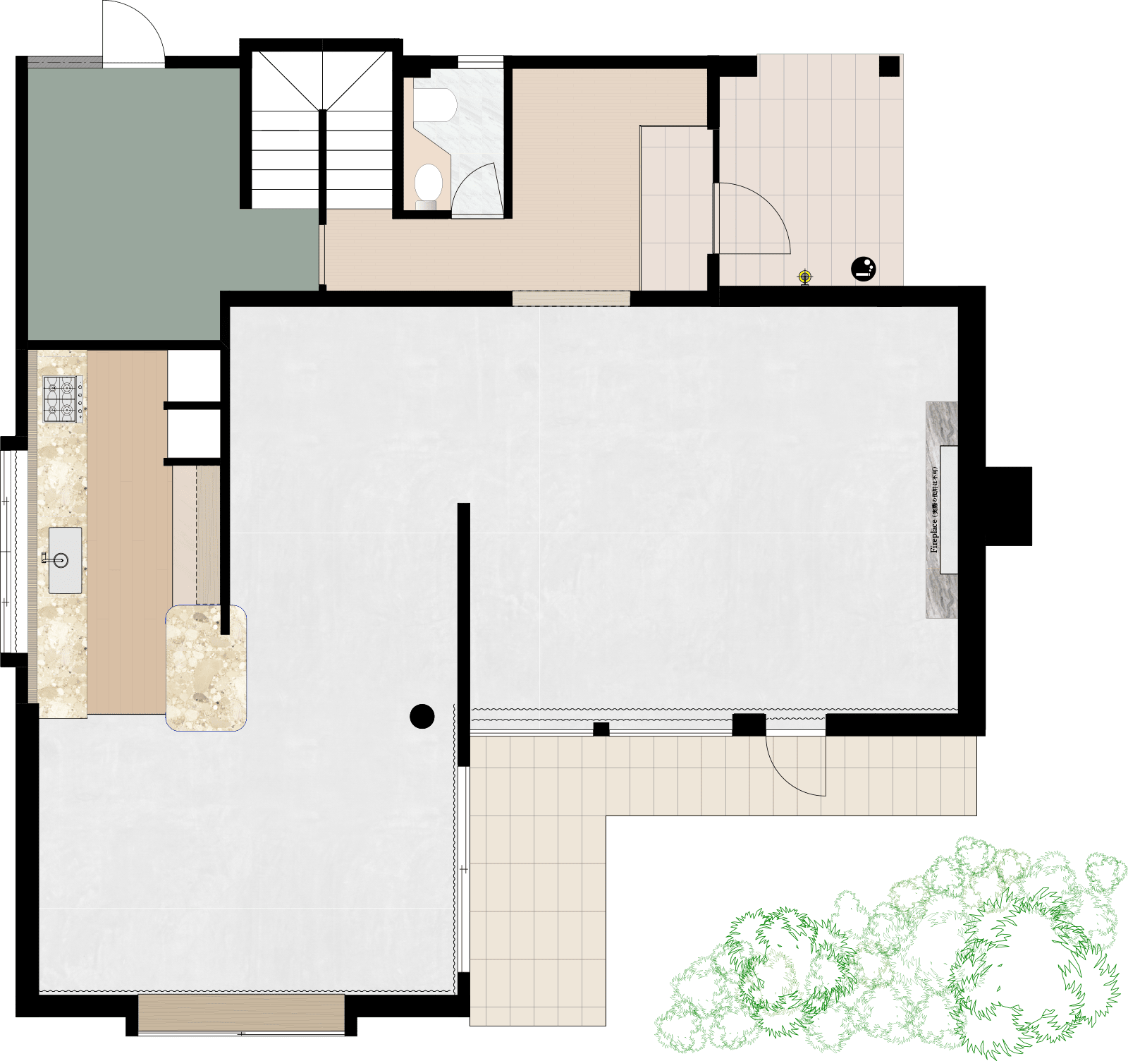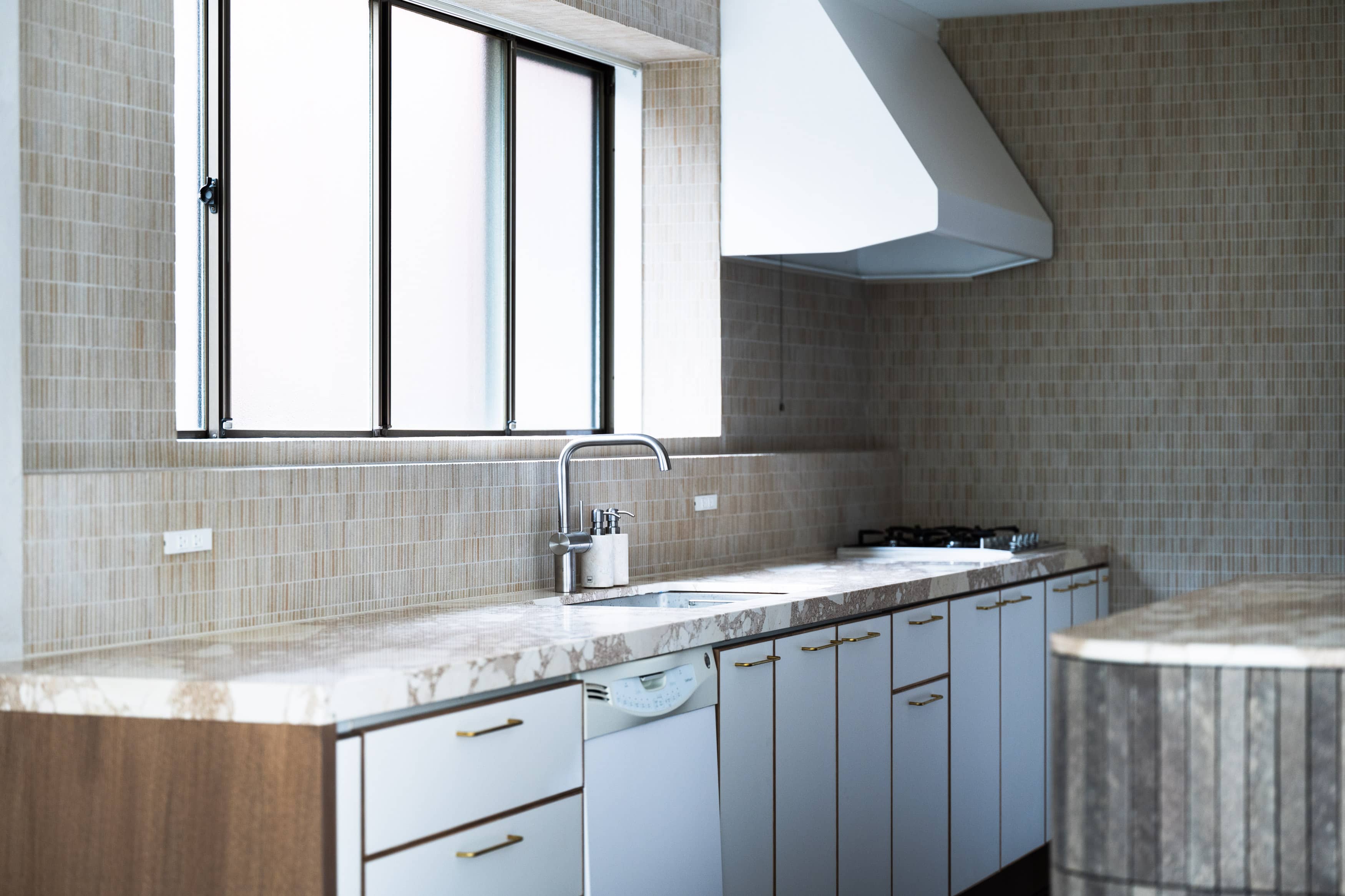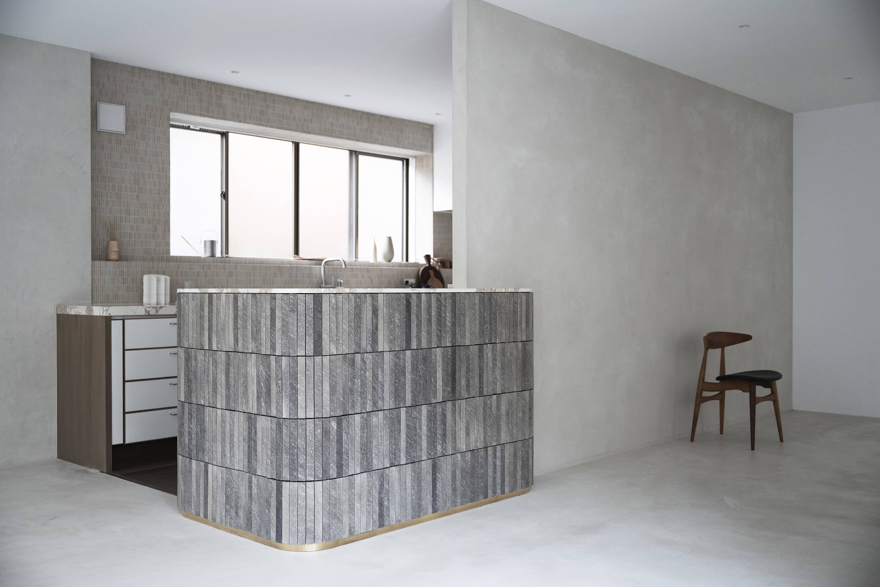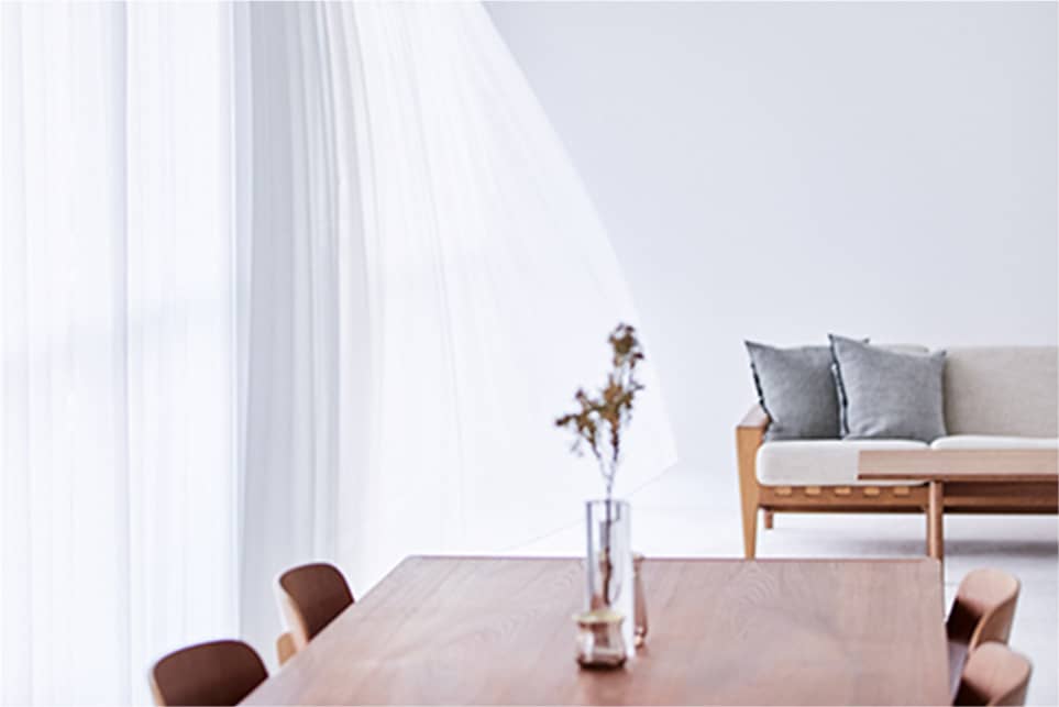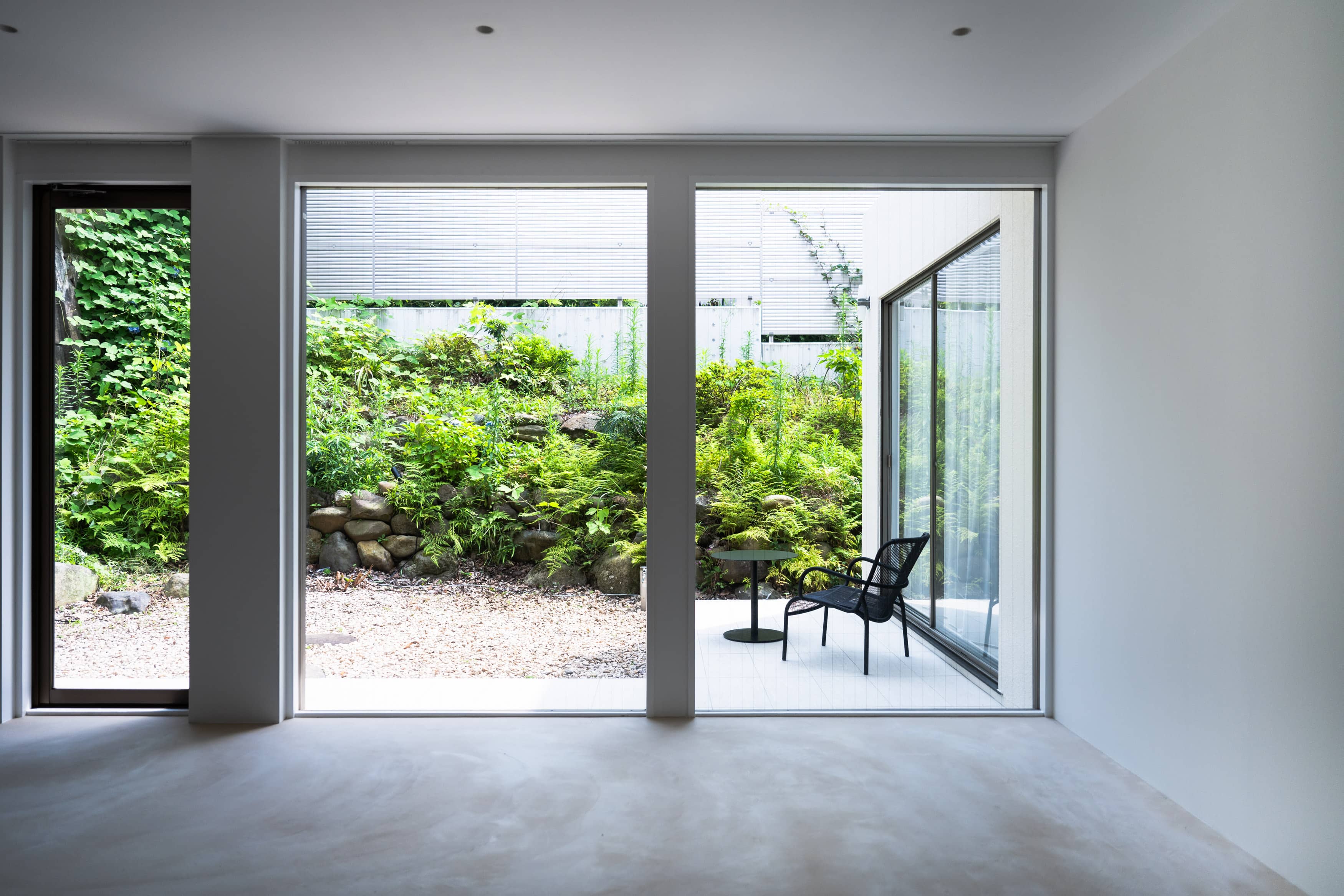 特別なベージュ色のモルタルで形成した床と壁を中心に、足元までの大きな窓から差し込む光がやわらかく広がり、キッチン横の窓からは、埋め尽くされるほどの気持ちよいガーデンの緑が入ります。