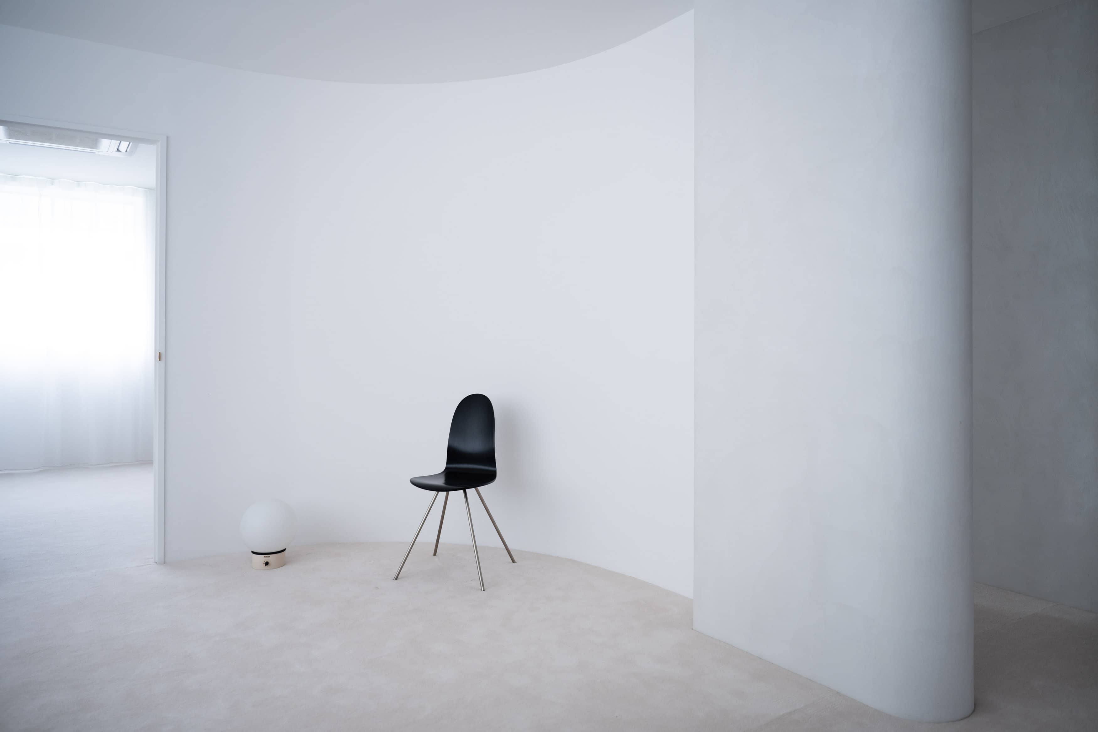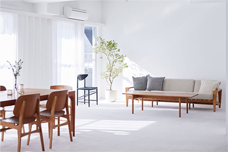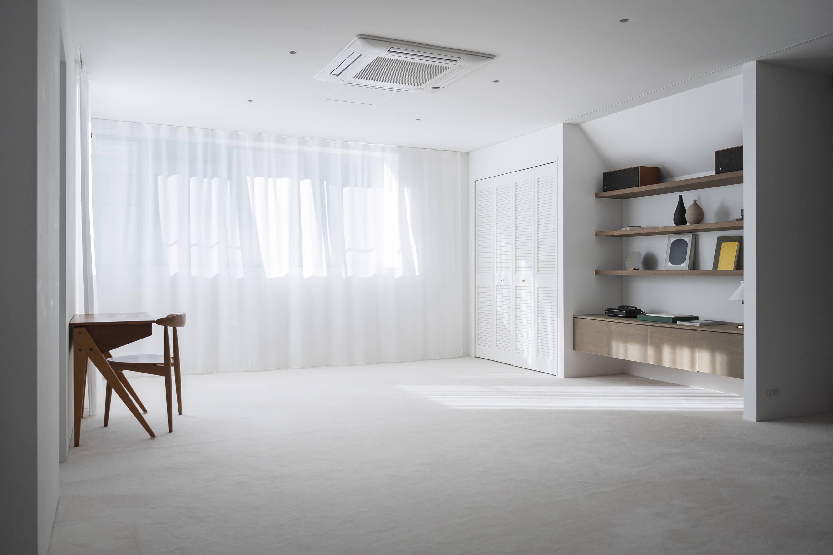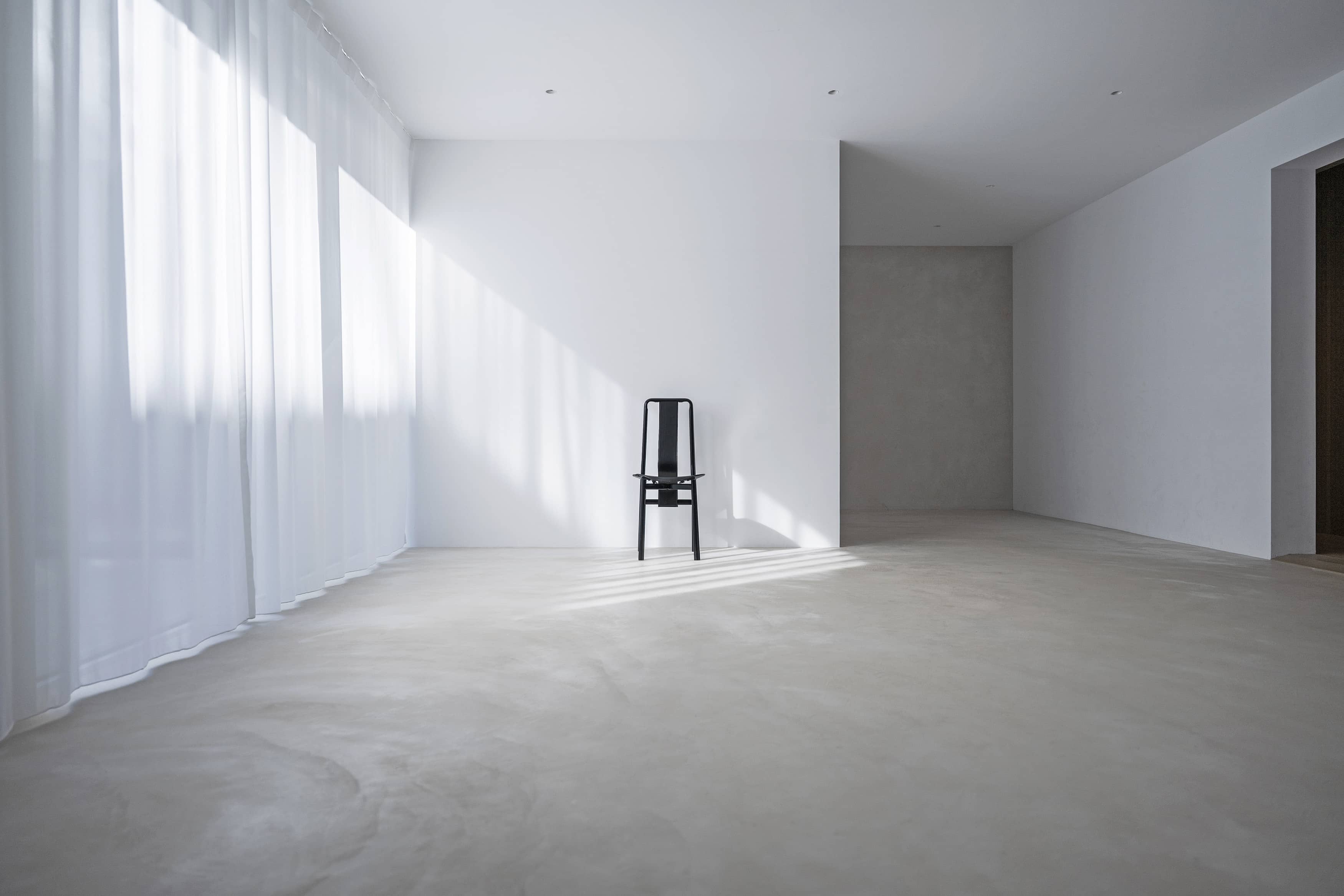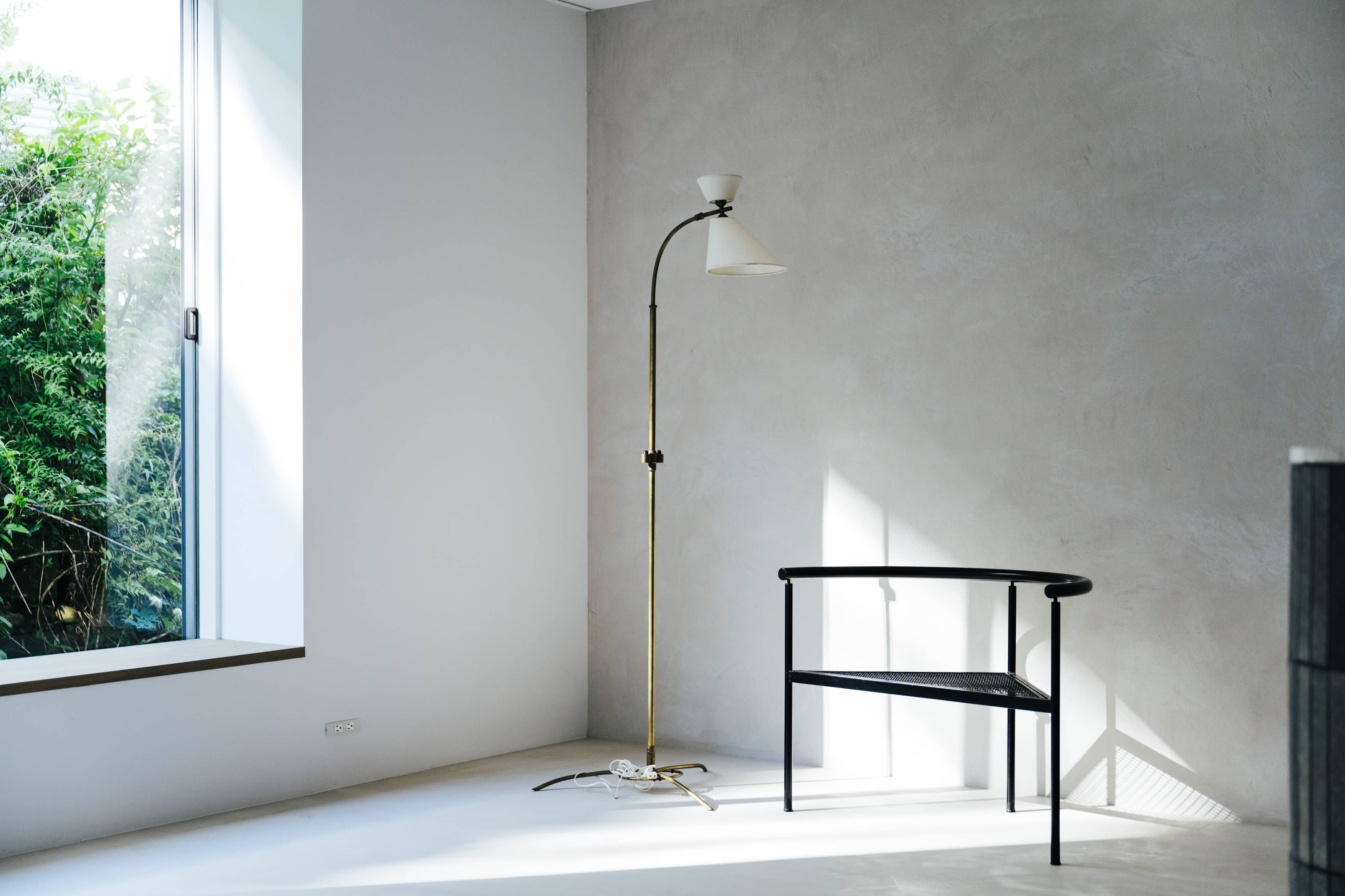 光の反射を極力抑えた壁や床の質感と、厳選されたヴィンテージ家具、広さを活かした余白とのバランスに、