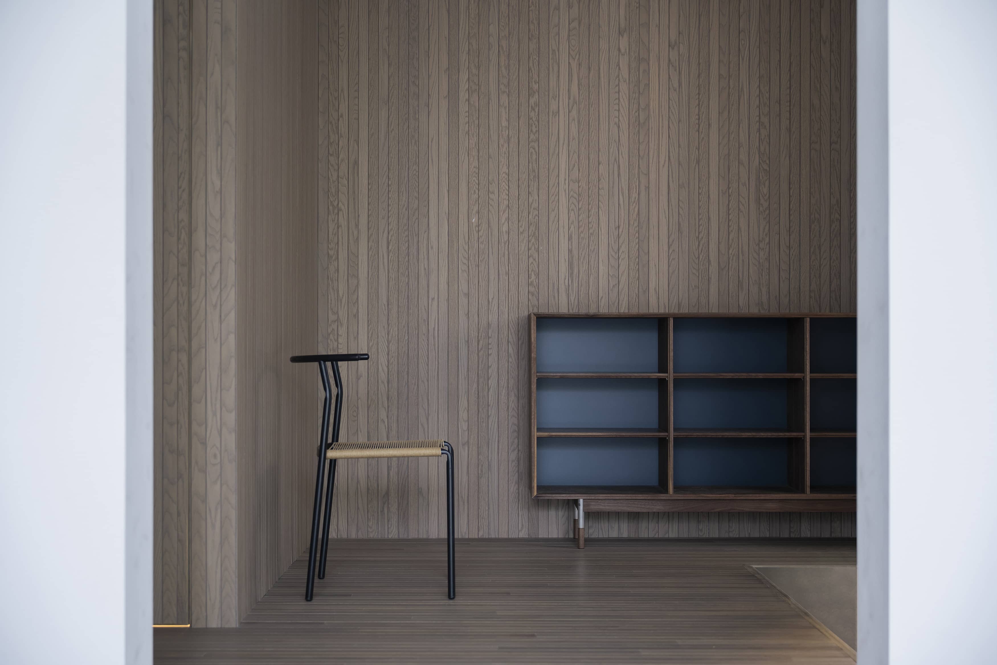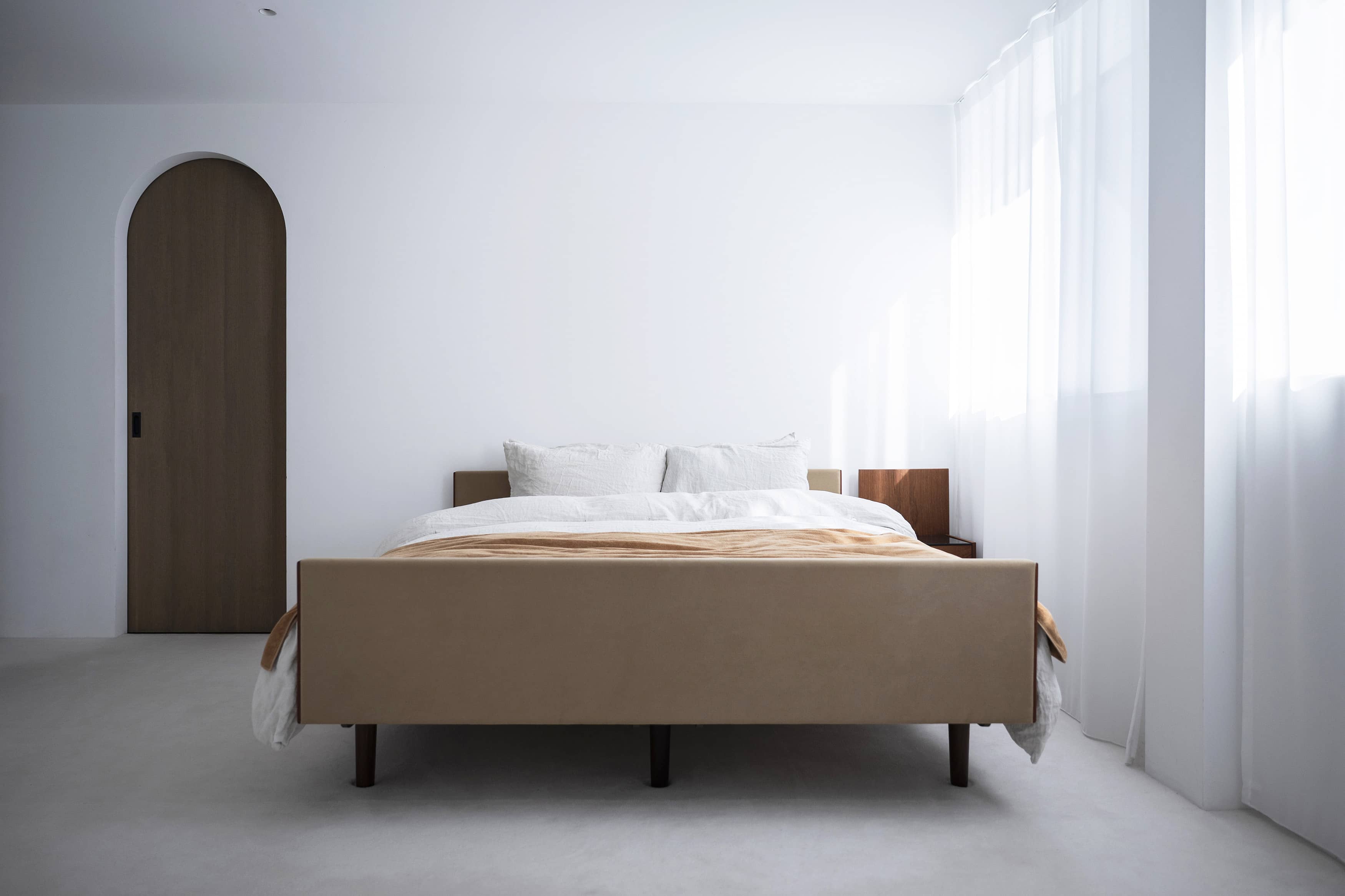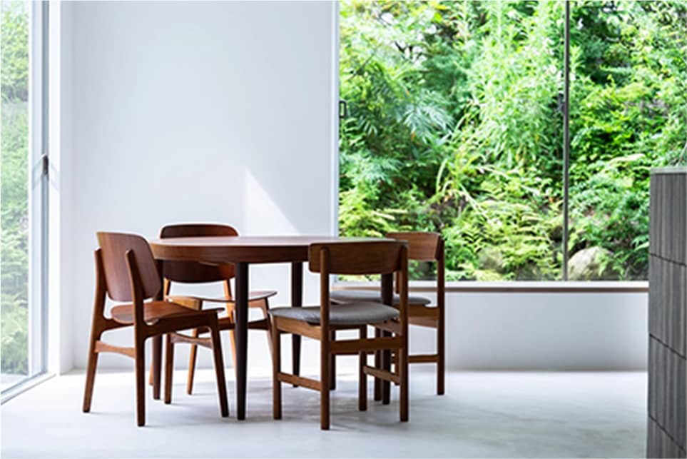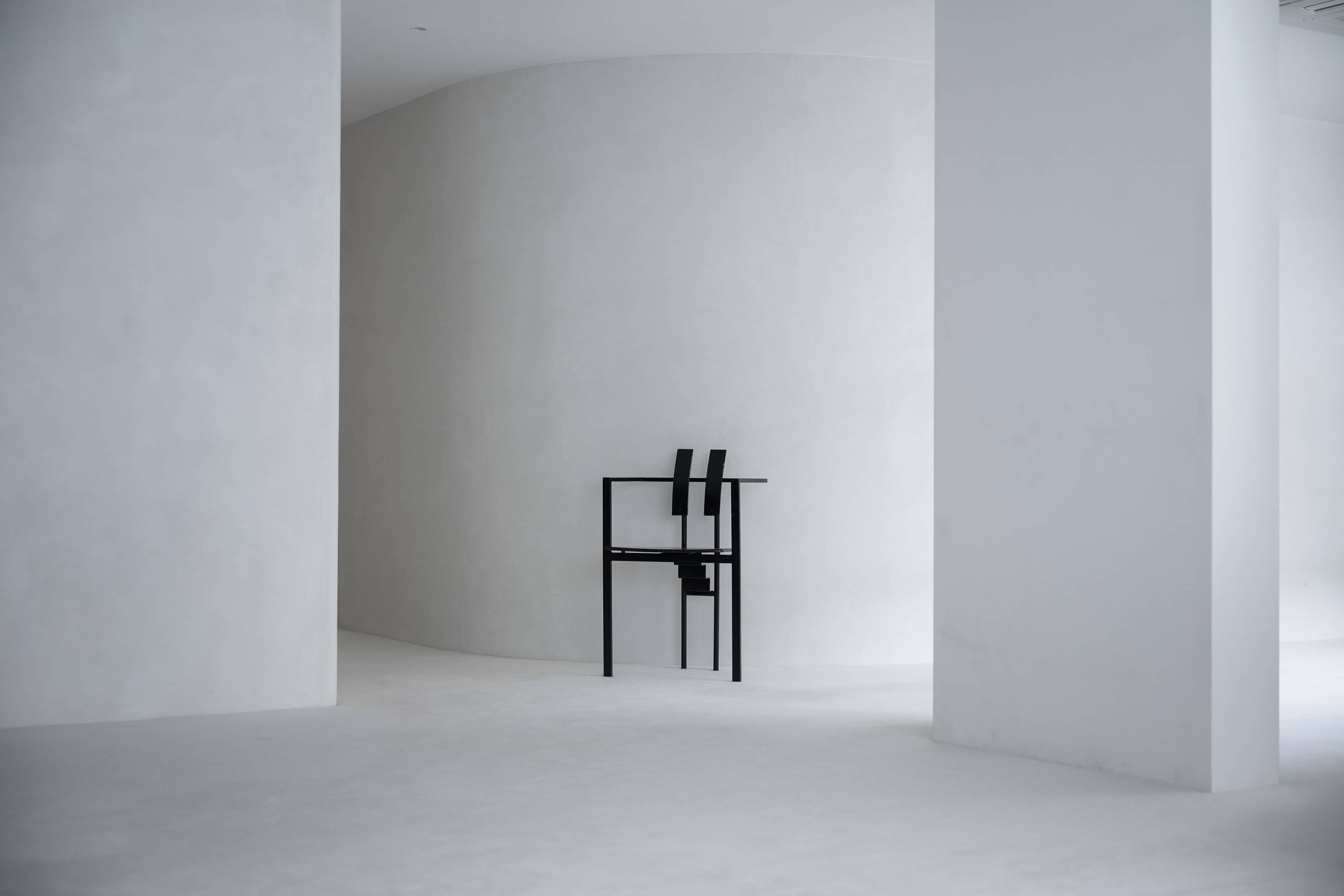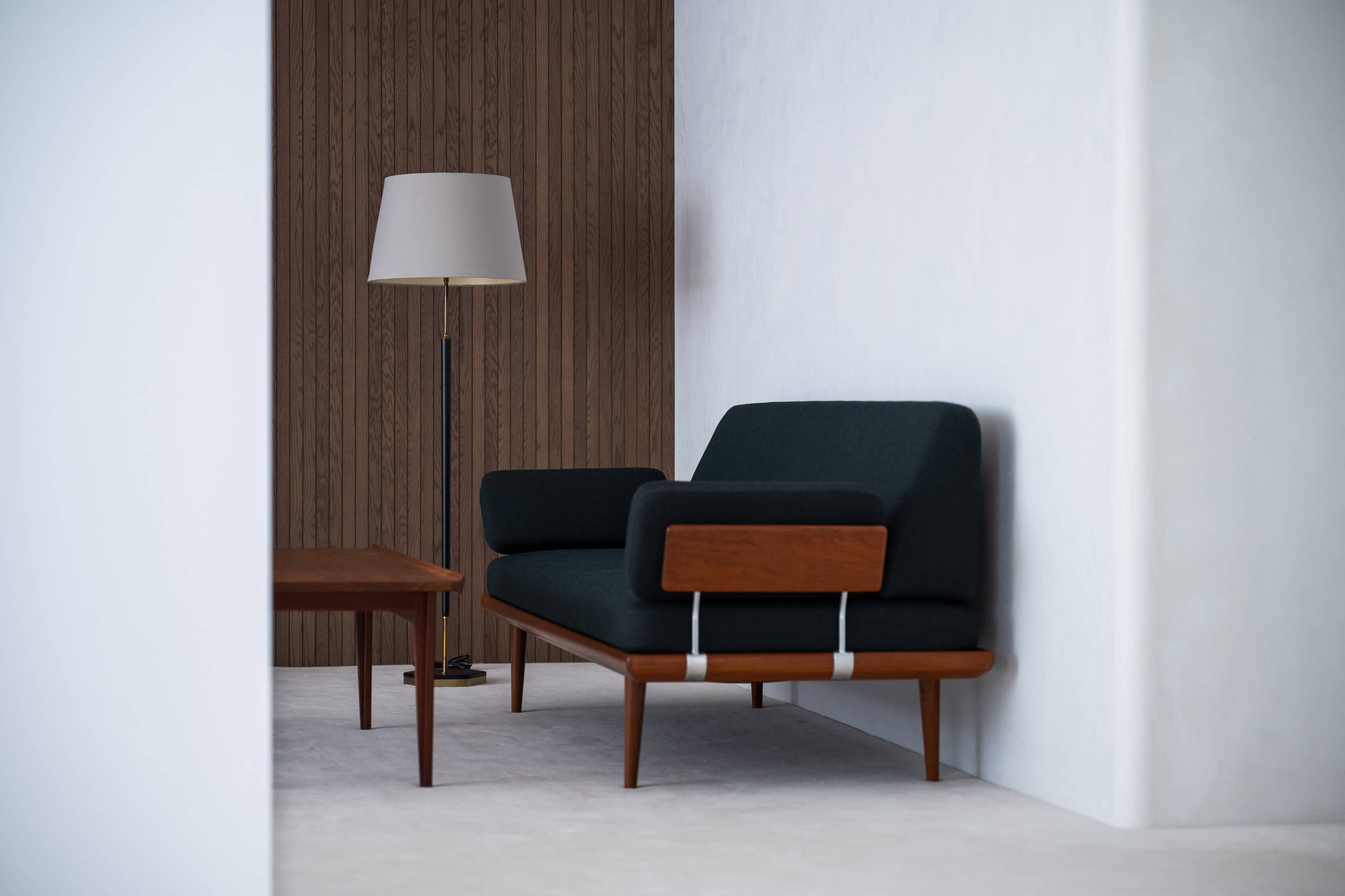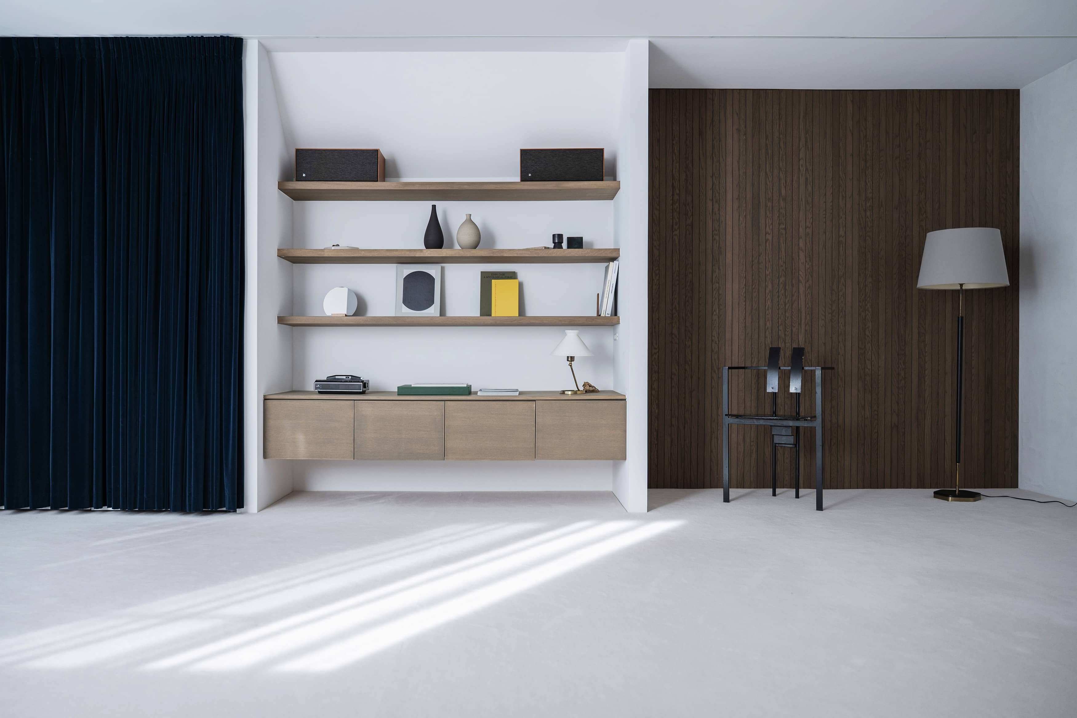 光の反射を極力抑えた壁や床の質感と、厳選されたヴィンテージ家具、広さを活かした余白とのバランスに、
