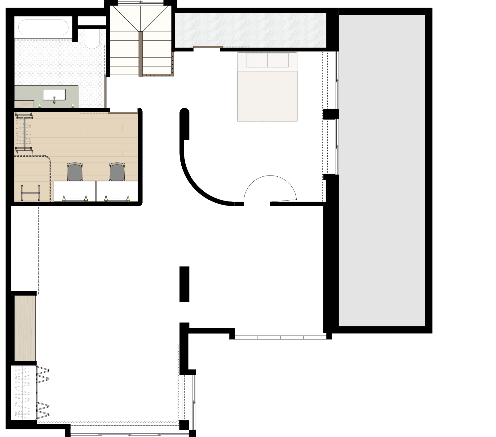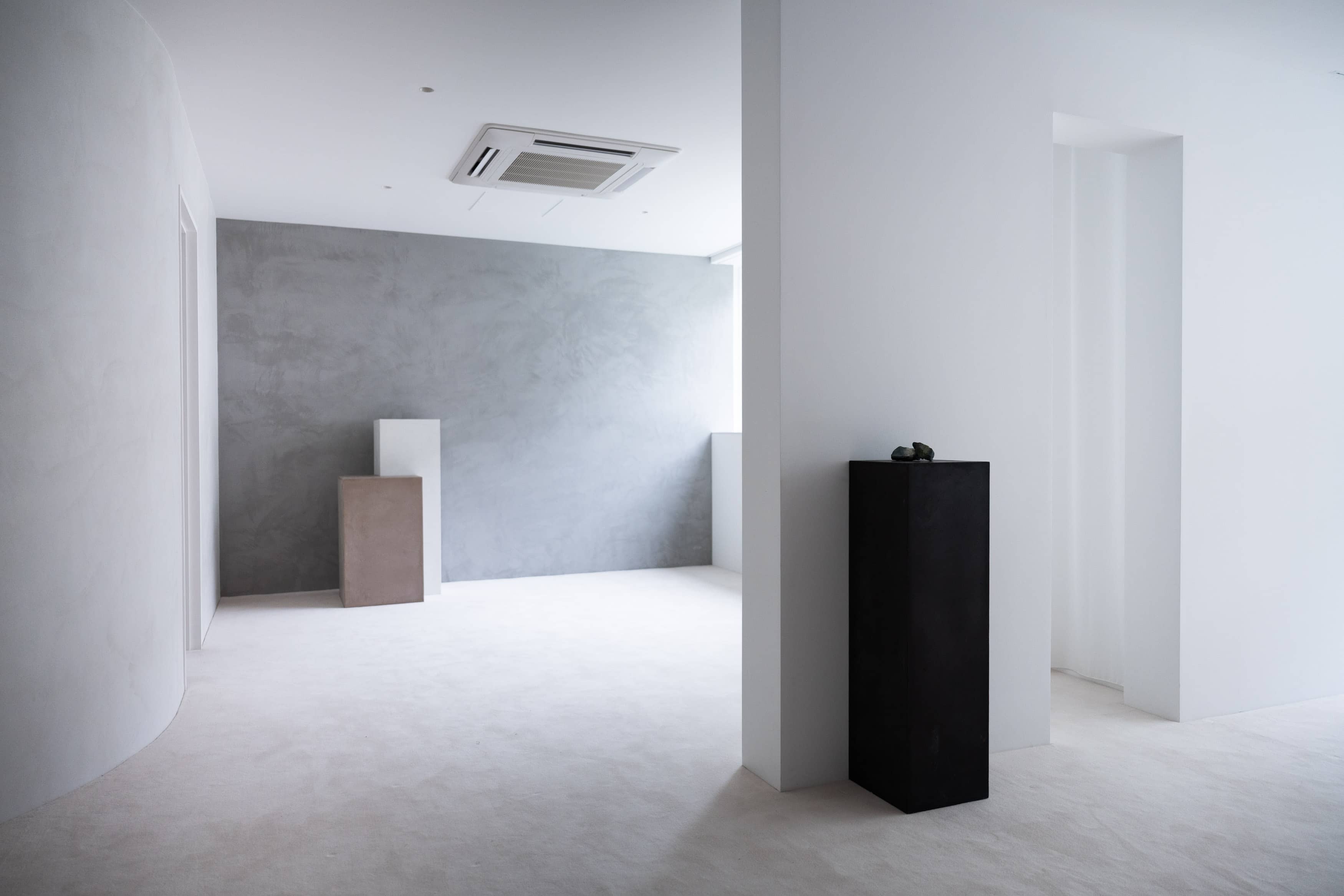 2階は重厚な白い絨毯に、質感のある白モルタルの壁が緩やかに空間を繋ぎ、アクセントとなるアール壁、ウッドやグレーモルタル壁が各エリアを演出します。